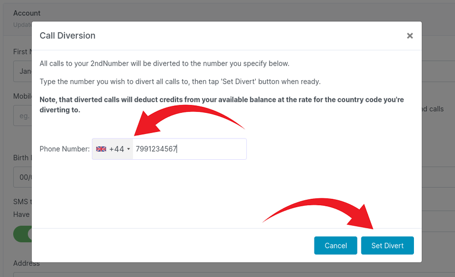 IMPORTANT: With divert switched on, your "real" mobile phone will be receiving calls from your 2ndNumber - that means the caller ID will show on your phone as your US or UK 2ndNumber. It may be the first time your mobile phone has received an international call, so do check: