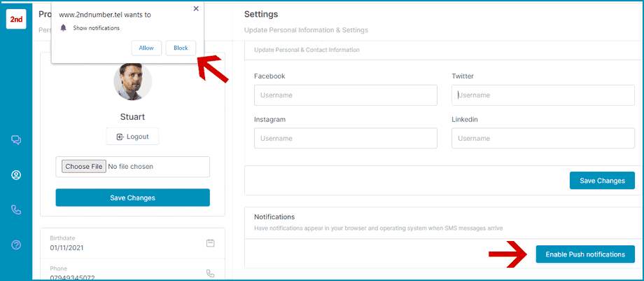 To enable this feature, you first have to log in to your 2ndNumber dashboard using Google Chrome (Chrome is essential, other browsers can't enable notifications) and switch on the 'Push Notification' feature by tapping the 'Enable Push notifications' button that appears half way down the page under the 'Profile' section: