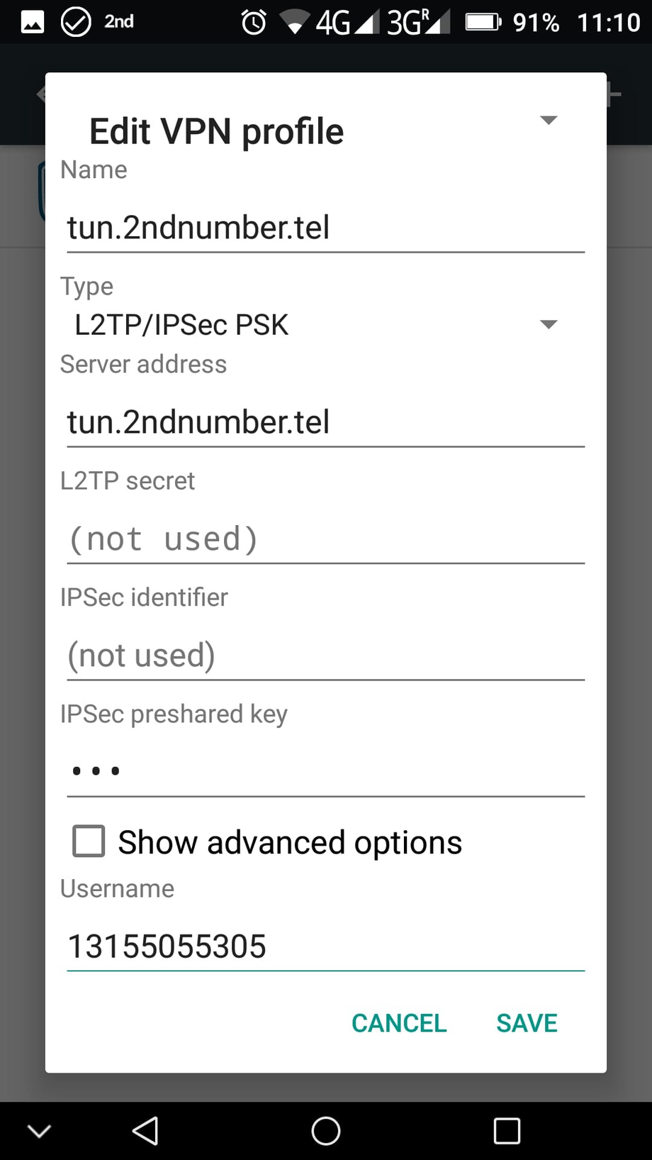 - Complete the details as per the image below, taking care to select "L2TP/IPSec PSK" from the "Type" dropdown. Also, you must enter: 2nd in the IPSec preshared key field. And finally of course, enter your Username and Password as presented to you on the 2ndVPN screen.