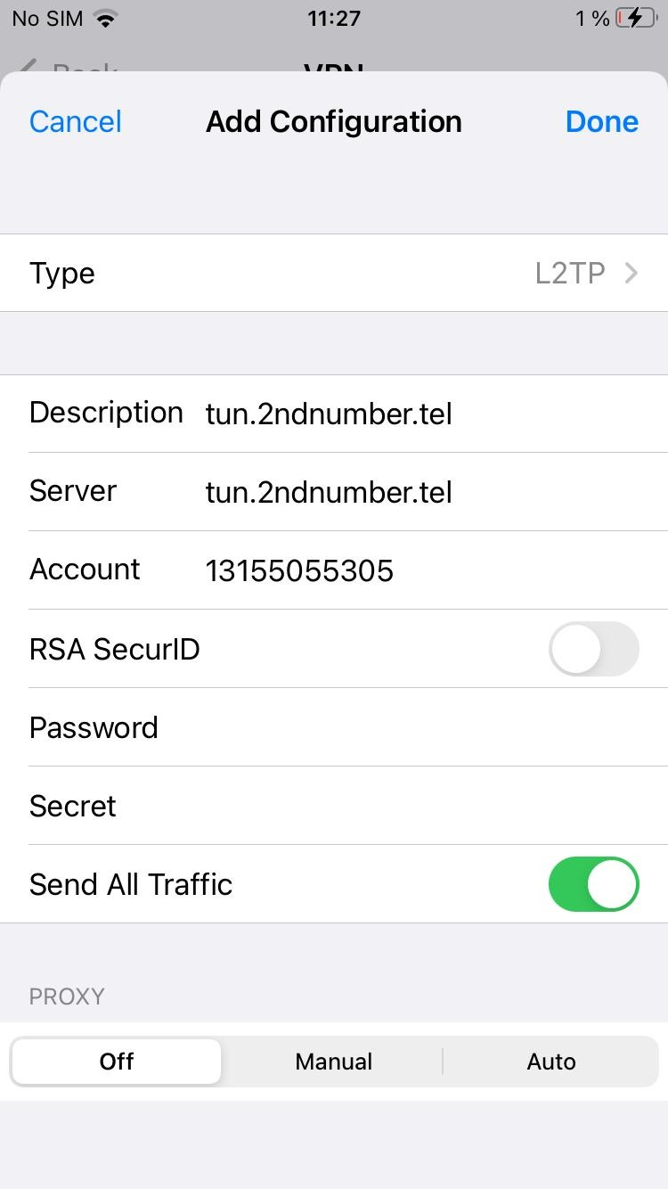 - Complete the form using the details below, taking care to select "L2TP" from the "Type" dropdown. Also, you must enter: 2nd in the "Secret" field. And finally of course, enter your Username and Password as presented to you on the 2ndVPN screen.
