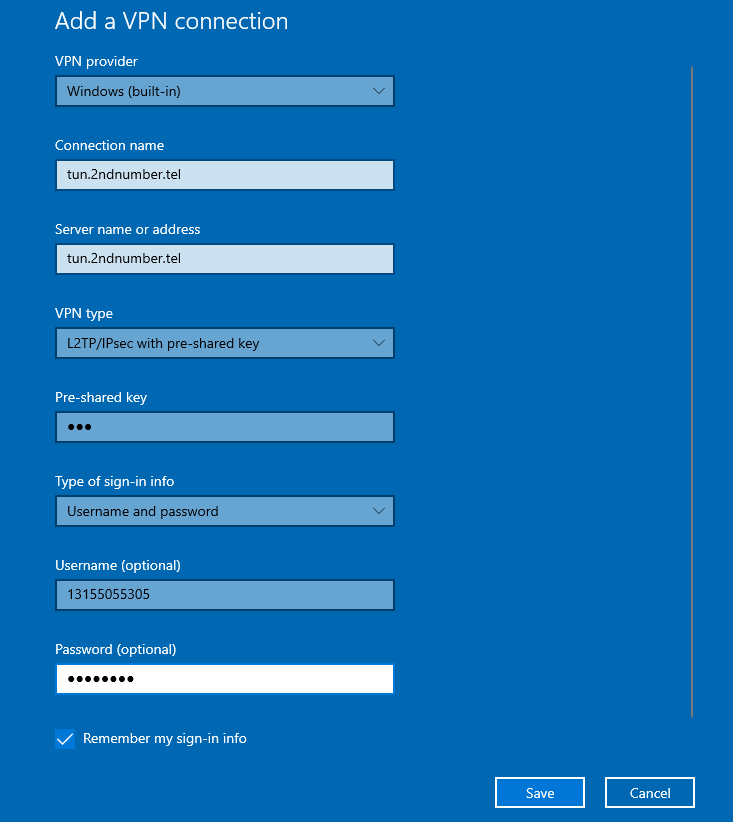 - Now complete the fields as shown below, taking care to select "L2TP/IPSec PSK" from the "Type" dropdown. Also, you must enter: 2nd in the IPSec preshared key field. And finally of course, enter your Username and Password as presented to you on the 2ndVPN screen.